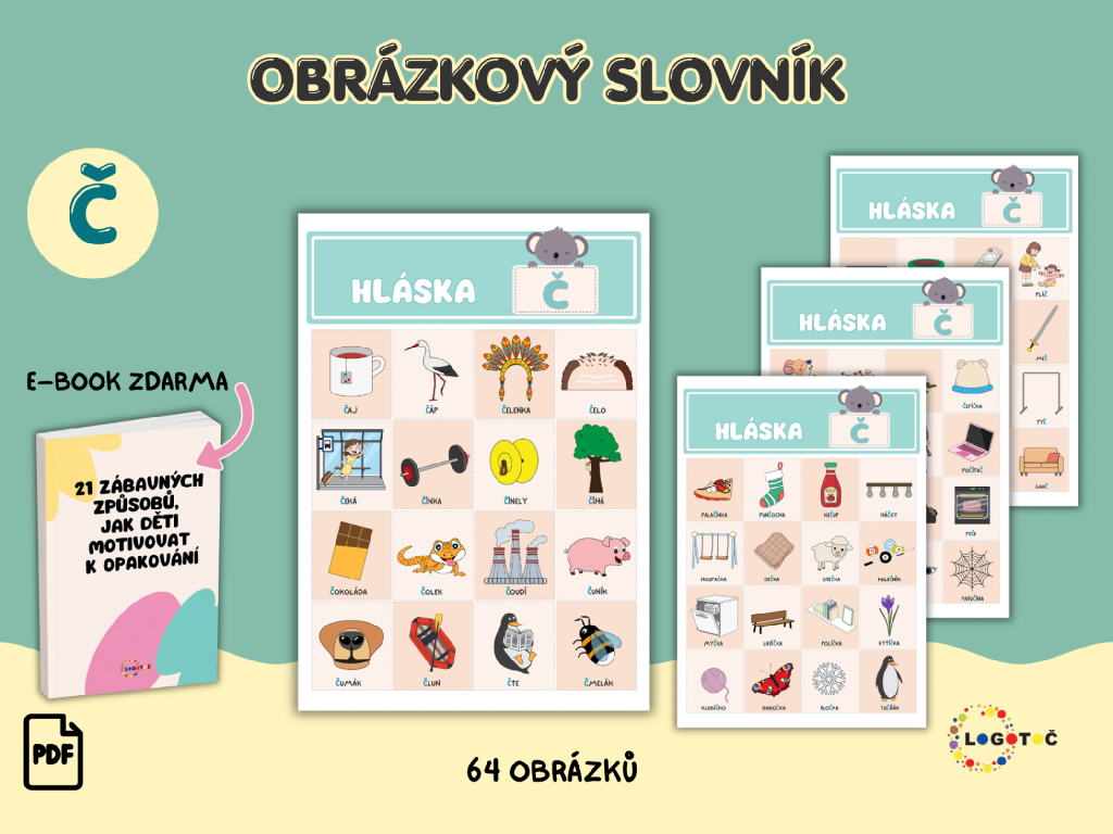 Obrázkový slovník je jednoduchá a přehledná pomůcka pro procvičování výslovnosti. Obsahuje 64 obrázků, které děti snadno pojmenují a využijí při hravém tréninku.