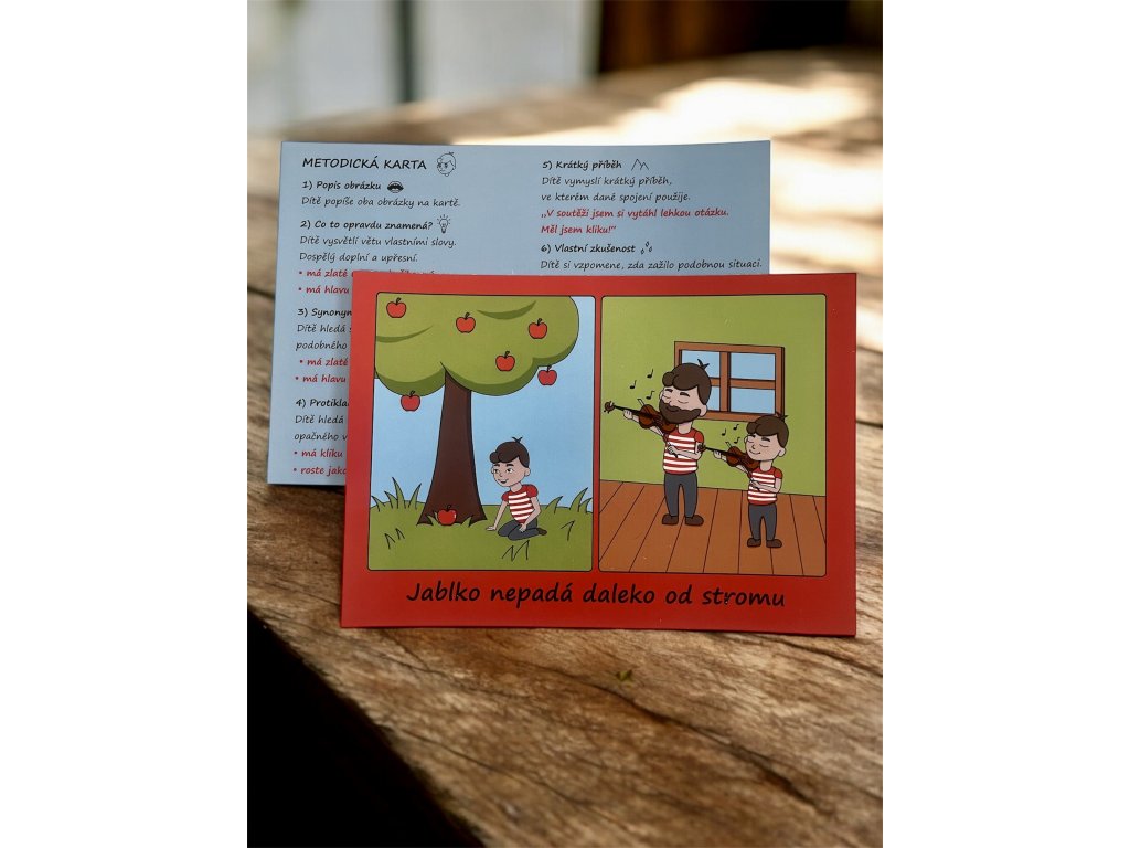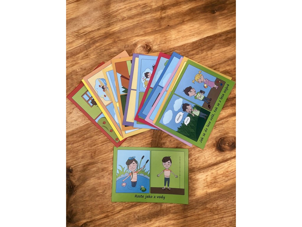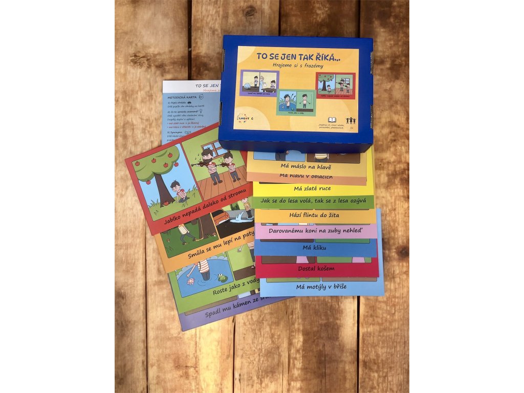 „Má máslo na hlavě.“ „Roste jako z vody.“ „Jablko nepadá daleko od stromu.“ Jenže, co to vlastně znamená? Sada obrázkových karet pomáhá dětem hravou formou porozumět přeneseným významům slov. Každá karta obsahuje věty, které lidé používají obrazně. Děti tak zjišťují, že některé věci se opravdu jen tak říkají, i když znějí zvláštně.